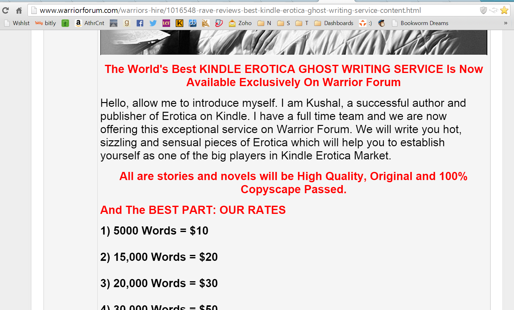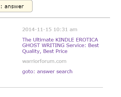 There I noticed the link in Ghost Author’s signature, which leads to an ad for his ghost writing services: http://www.warriorforum.com/warriors-hire/1016548-rave-reviews-best-kindle-erotica-ghost-writing-service-content.html